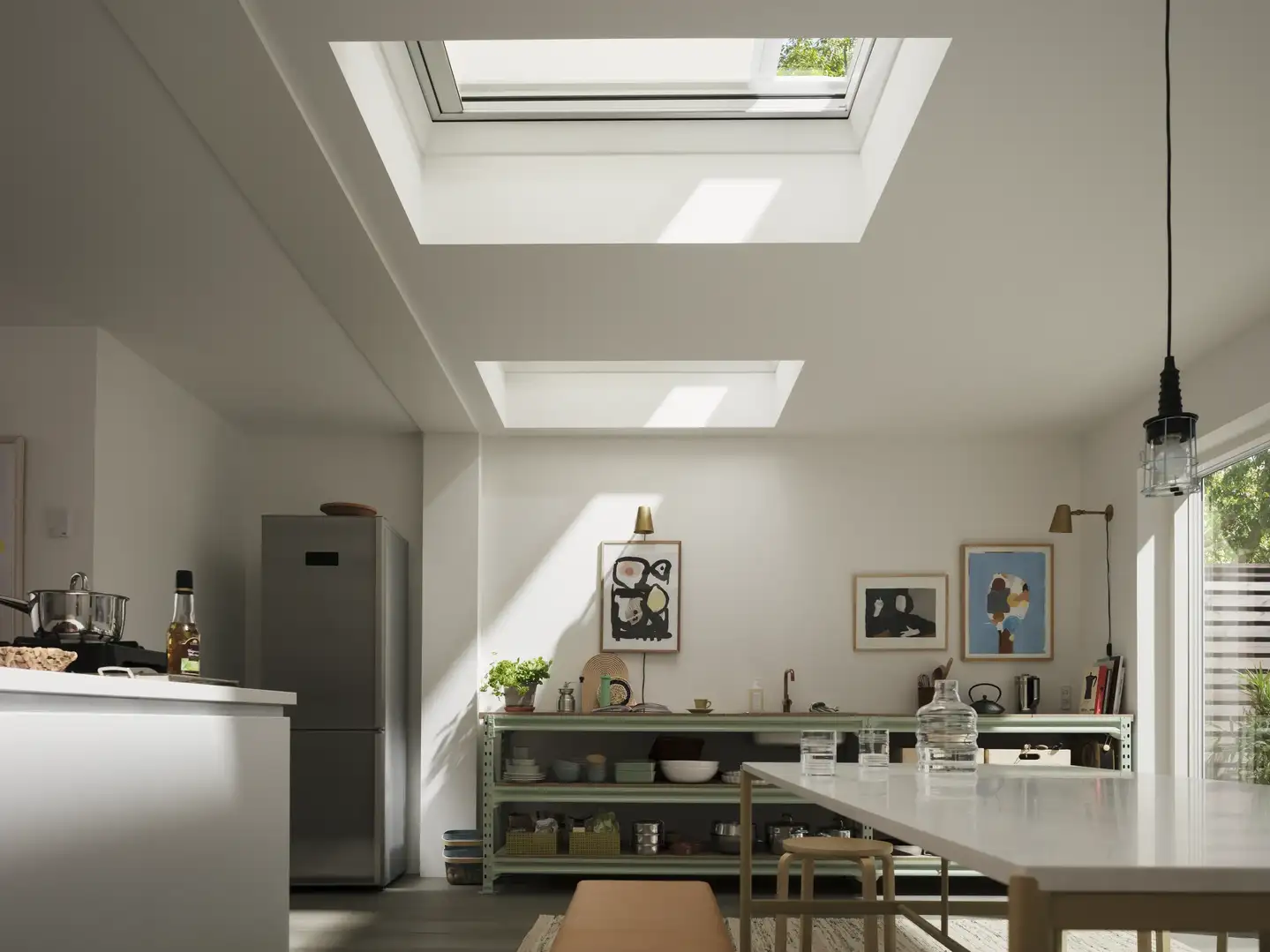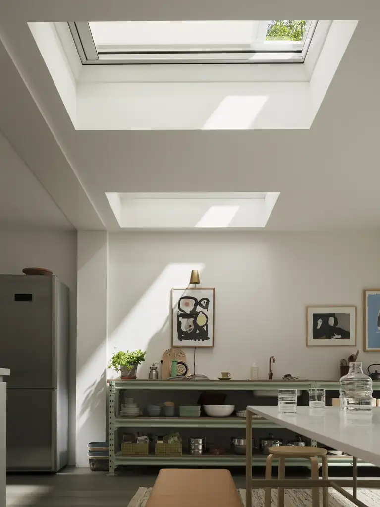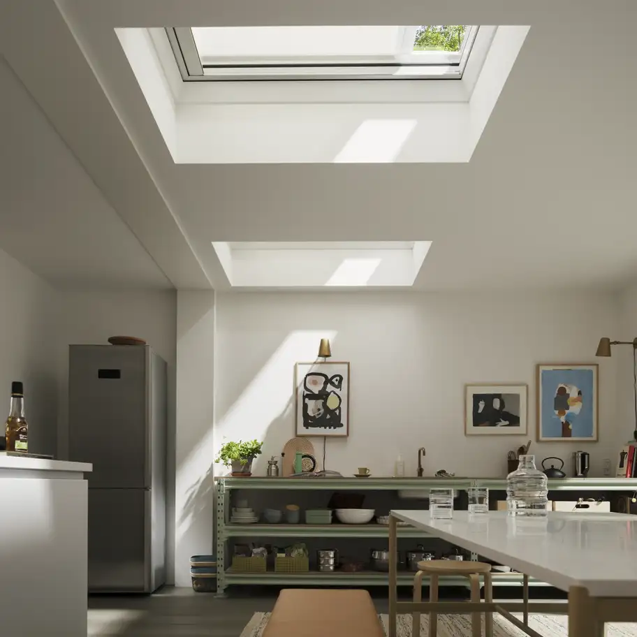 VELUX lichttemperende plisségordijnen voor platdakvensters bieden lichtregeling, privacy en een strak uitzicht wanneer ze niet gebruikt worden.